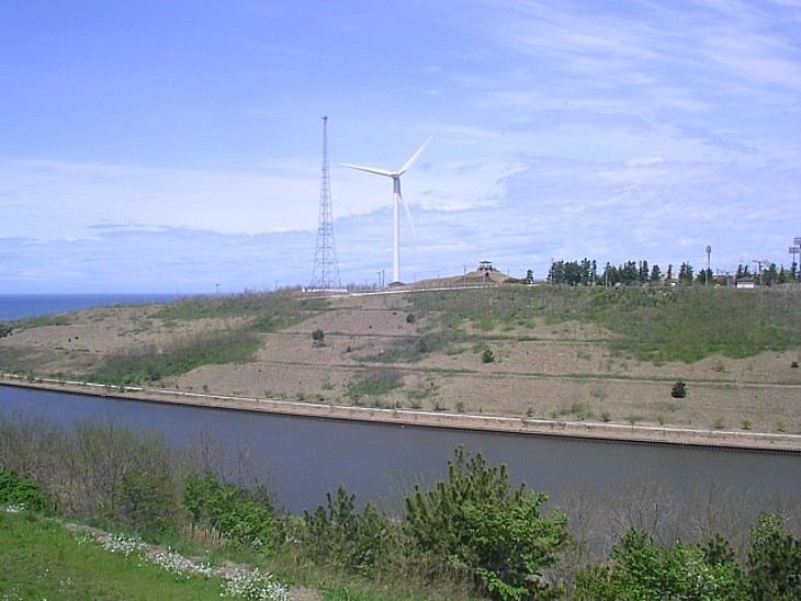 駅舎の裏は日本海まで見渡せる展望広場。水路の対岸が内灘町総合公園で周辺は金沢市のベッドタウン。
