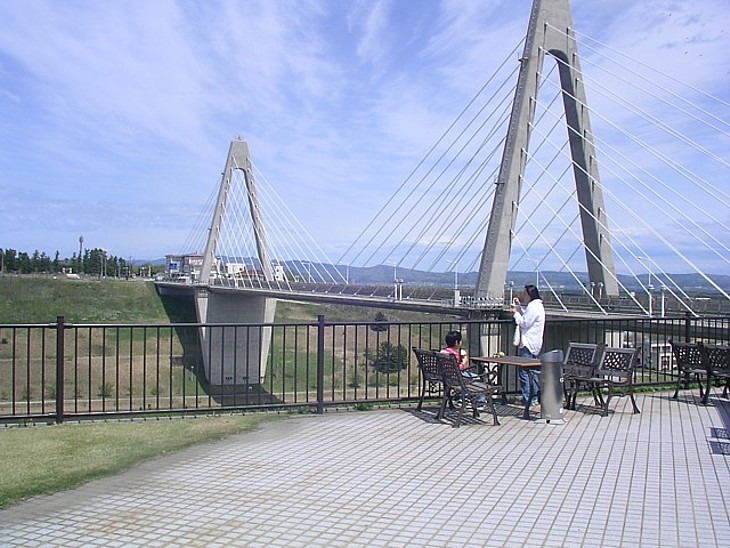 道路寄りのデッキから内灘大橋を。この橋を渡った右側(約500m)に町営の温泉施設「ほのぼの湯」がある