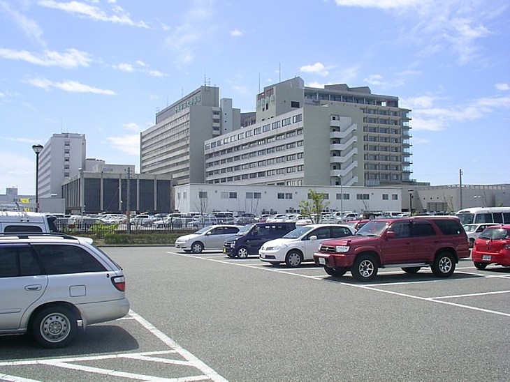 駅舎の前は金沢医科大学キャンパスと付属病院。地域医療の中核で、日本海側では唯一の私立医科大学。