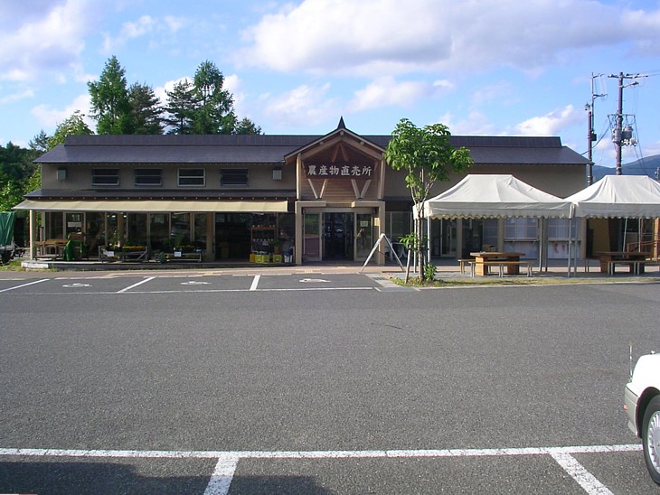 左隅の産直野菜売場は広い別棟で繁忙期にはテント販売も出る。軒下にはガーデンテーブルが数セット。