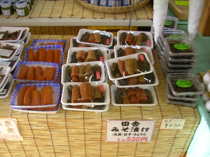 こちらも530円均の4品、田舎みそ漬け(大根・茄子・きゅうり)と国産いなご甘露煮。旅人に嬉しい、地域の味。