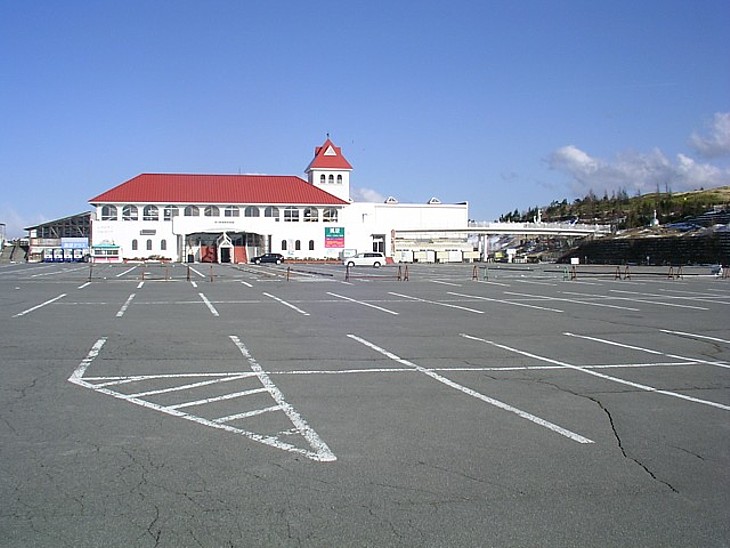 行楽シーズンには満車も珍しくない広い駐車場の北側から駅舎を撮影。右側に美術館への歩道橋が見える。