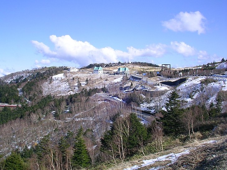 展望台の東側、ビーナスラインのカーブ地点に葵屋根のレストランとガソリンスタンドが見える。