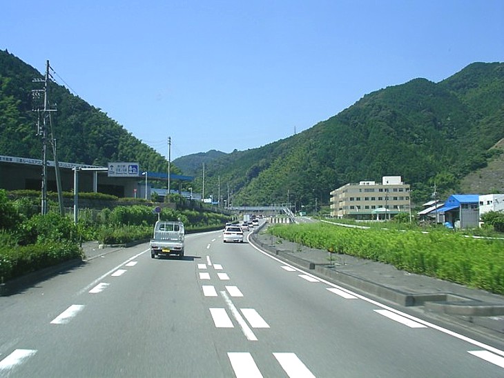 丸子宿を過ぎた片側2車線のバイパスが峠へと続く。遠くの架橋はバイパスを跨いで峠に向かう旧道。