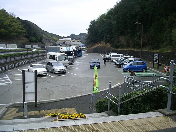 駅舎の前から見たメイン駐車場は国道側に大型車・普通車は右側に停める配置となる。