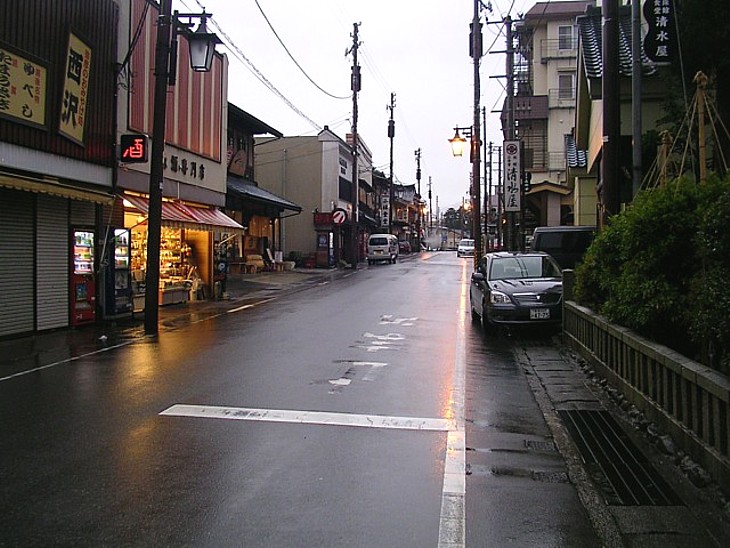 弥彦神社門前の町並み。悪天候の影響で閑散としているが週末や休日は結構混雑するらしい。