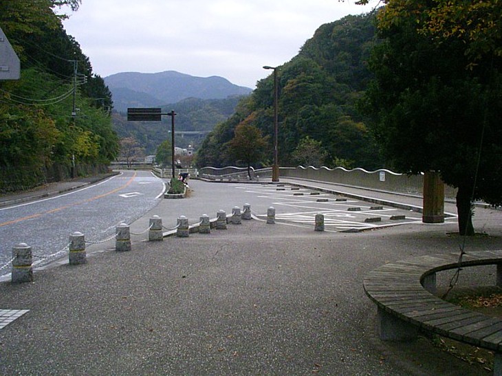 対向車線側の駐車儀には川を眺める小さな木陰にベンチがあり、少し先・橋の横から車で河原に降りられる。