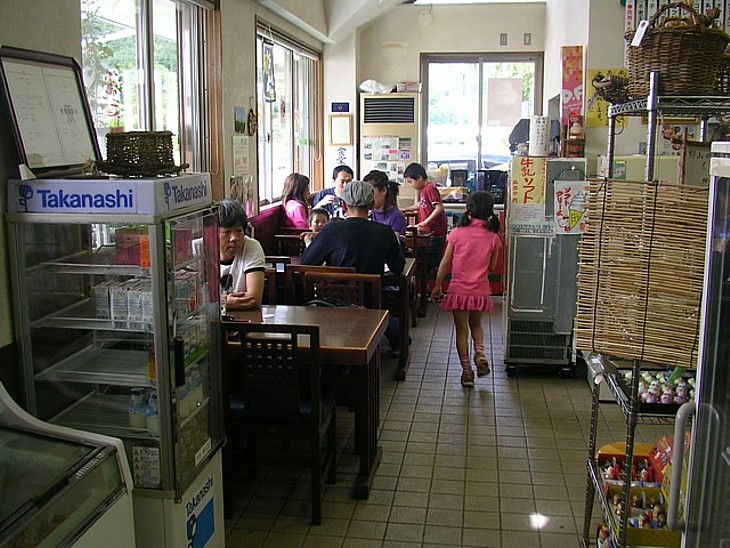食事処はテーブル席が3卓のみ。メニューには御飯類も載っているが、軽く麺類で済ませる方が良い。