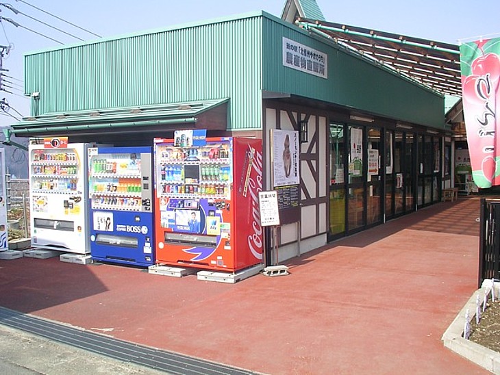 手前に自販機が並んでいる産直野菜売り場へ。雪の季節に備えて通路には滑り止め塗装が施してある。