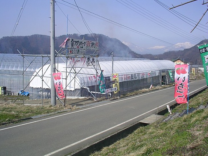 リンゴ畑の横はイチゴ狩りを兼ねた直売所、5月の連休近くまで楽しめる。背後の鴨ヶ嶽の向う側が中野市街。