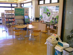 情報コーナーに丸テーブルと椅子が数脚。ここで無線LAN接続可、狭い駅舎なのに休憩スペースを確保しているのは立派だ。 | |