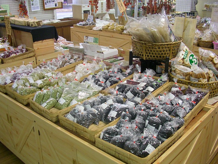 小豆・大豆・黒豆など、地元で採れた豆類も豊富に並び、上段には珍しい「きはだの皮」もある。