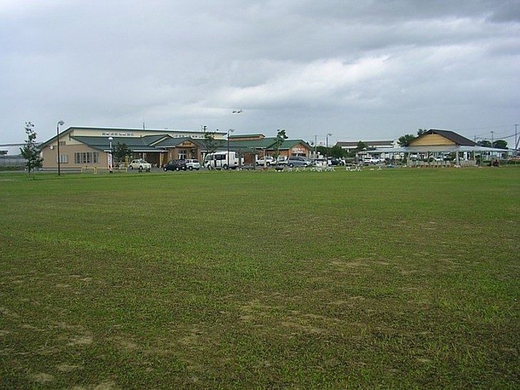 隣接した広い緑地公園から道の駅を。撮影場所背後の国道沿いにも24時間利用できるトイレがある。