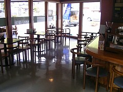 10時〜18時、珍しいことに麺類も和食も扱っていない。窓が広く明るい雰囲気、テラス席(セルフサービス)も利用できる。 |