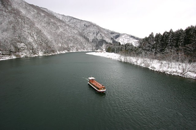 阿賀野川の雪見舟 まさに墨絵の風景だ。