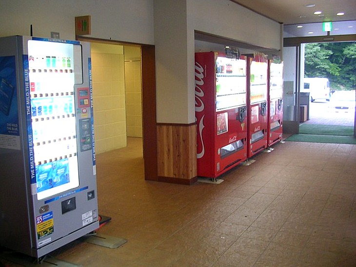 トイレ前の自販機コーナーは道の駅の閉館後も利用できる。すぐ右が階段で、その横にも6、7台停められる。