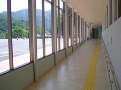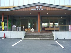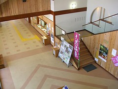 右: 観光センター(道の駅)正面入口の階段部分。右側に自販機コーナーとトイレ施設、左側に物産コーナーと観光案内などを配置している。