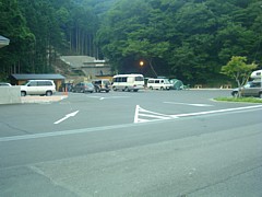 上: 深い木々に囲まれた駐車場。50台前後のキャパシティだから決して広くはないが、休日の観光客は会津西街道を通る車の休憩か湯西川温泉を