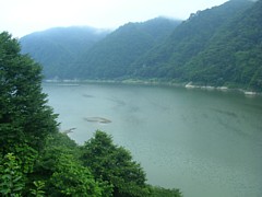 中: 駅舎の前から五十里湖の上流(湯西川温泉方向)を撮影。約5km上流に湯西川ダムがあるから本来は水量が少なくなる場所なのだが、右手の