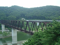 右:すぐ前に野岩鉄道の鉄橋と、福島県に向かう会津西街道の五十里岬トンネル入口が見える。この先は名うての豪雪地帯が続く。