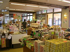 上: 物産コーナーの風景。扱っている品物の9割以上は問屋経由の既製品でオリジナル商品は皆無に近く、はっきり言って全く面白くない。土産物を