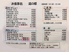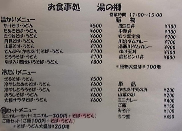 メニュー例:麺=ざる500円〜山菜orかき揚げ700円・カレ-700円・牛丼700円・蕎麦+御飯セット1000円・メニュー詳細はこちら。 |