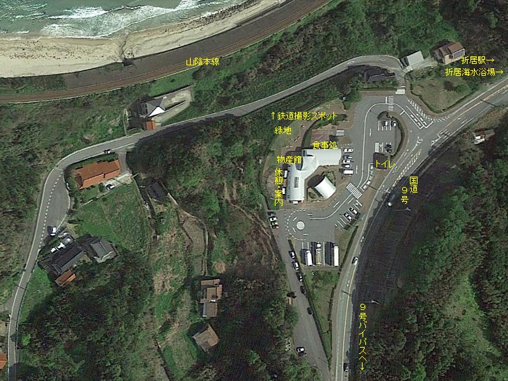 美しい海岸まで150m、山陰本線に阻まれて直接行く道はないのが残念。小さな駅だが食事処は充実している。