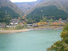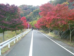 橋際の出島には小・中学校が建つ 千代の沢園地手前で紅葉を撮影 この紅葉並木は一見の価値あり この先が園地と小公園、展望台の入り口