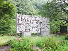 左&中:伝承では勝頼夫人は侍女16人と共に日川の淵に入水したとも伝わる。景徳院前の無料駐車場横に記念碑が建てられている。