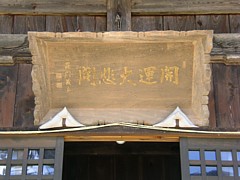 右:金文字で「開運大悲閣《と書かれた本堂の扁額。その左は...毘門義氏と読めるが、詳細は判らない。