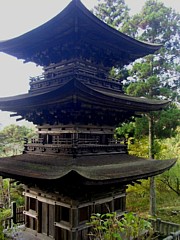 左:三重塔は南北朝時代の正慶二年(1333年、この年5月に鎌倉幕府滅亡)の建立。檜皮葺きで高さは61尺2寸7分(18.56m)、