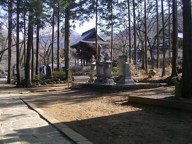 甲将殿から山門を。本堂前には石碑や歌碑が多いが、ここは清浄な空気に包まれている。