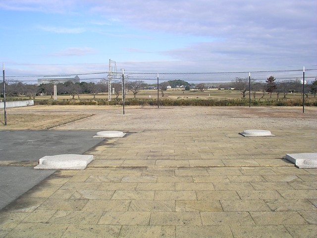 左の奥に復元中の第一次大極殿(遷都当初の大極殿)を復元している巨大な覆屋が見える。