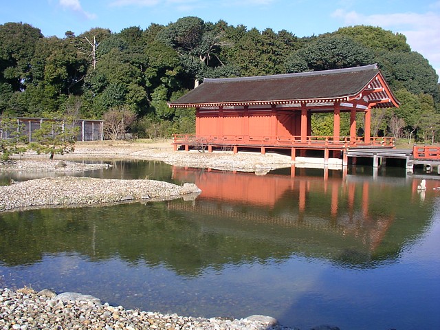 庭園は東西60m×南北60mの逆L字の池を中心にして配置された建物群で構成されていた。