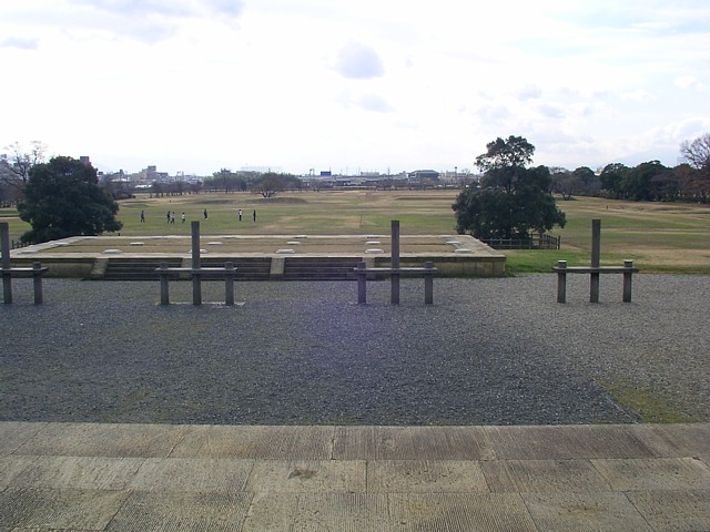 第二次大極殿の南、朝堂院や朝集殿があった遺跡部分を撮影。この延長線が壬生門に至る。
