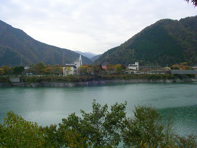橋際の出島(実際には半島状の出っ張り)には小・中学校が建つ