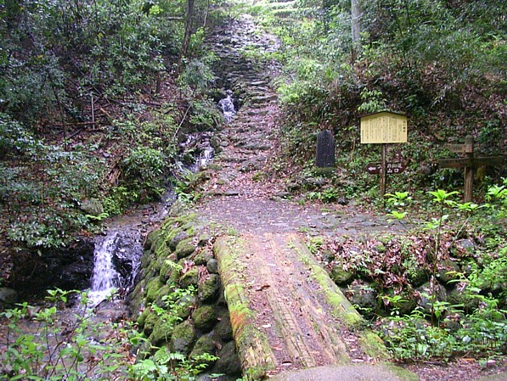 この木橋が蔦の細道の入口。雨の後で足場が悪く今回はここまで、旧東海道分岐へと引き返した。