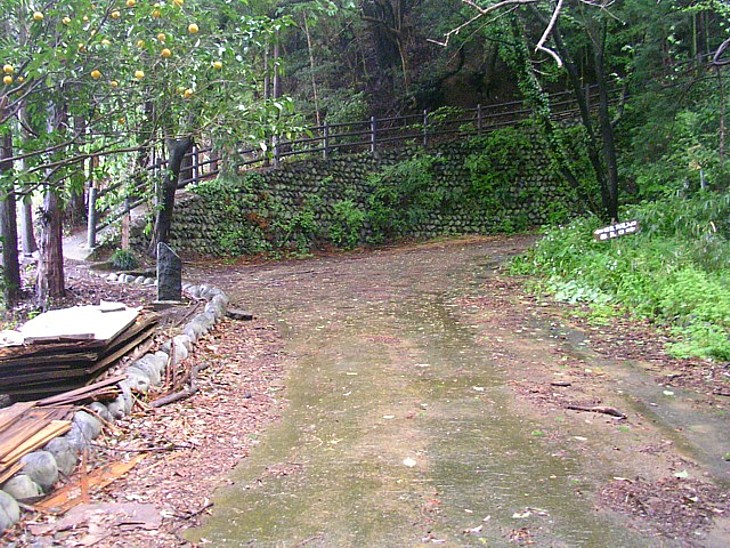 やがて作業道は右へ折れ、旧東海道は細道となって石垣の上へ延びる。峠の頂上まで、残すところ150m。