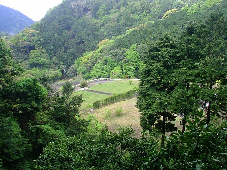 分岐点手前で視界が開け、左に大正トンネルへの旧道・すぐ下に明治トンネルへの旧・旧道と緑地が見える。