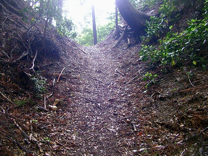 岡部側の峠の頂上。地蔵堂からここまでは約700mの登り道で、ゆっくり歩いても30分ほどで到着する。