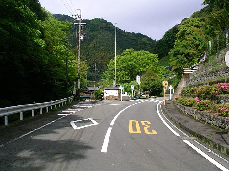 旧東海道と旧国道1号の分岐点。右へ進むと慶龍寺の前を通って「昭和のトンネル」を抜け岡部側に至る。