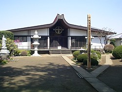 中: 本堂の棟には岡部氏の家紋「丸に跳ね十字」(使われ始めた時代は不明)が見える。開山和尚は栄朝禅師、臨済宗の開祖栄西に師事し、