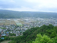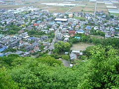左: 北西の北江間方向。中央左の山裾が義時菩提寺の北條寺、その右奥の平地が嫡男の安千代丸が大蛇に襲われた伝承の残る大池の跡。