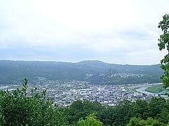 中: 南東、田中山の方向。八重姫が入水した古川の上流が見える。山並みを縫う北條道を辿れば伊豆東海岸、宇佐美から伊東荘へと下る。