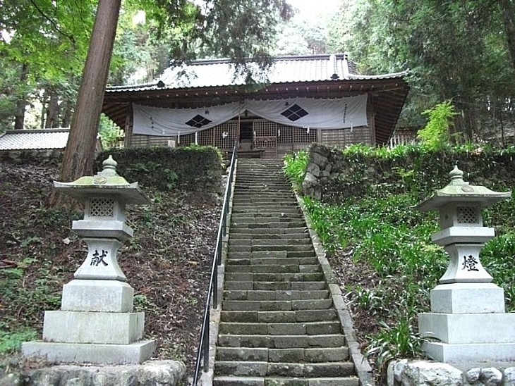 舞殿から拝殿を見上げる。格子の板戸は社殿に共通、石段は徐々に急傾斜かつ短くなる。