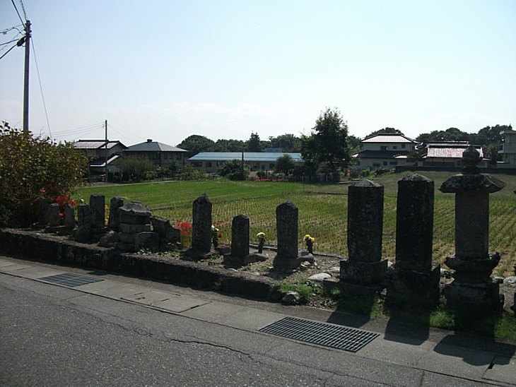 石塔の背後が信義館跡と伝わる。農地の奥、石柵に囲まれた10m四方ほどのエリアが確認されている。