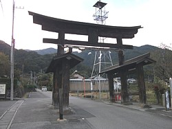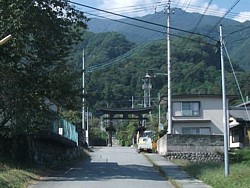 右: 門前へ500mの距離に建つニの鳥居。横の「武田の郷ふれあいホール」(公民館?)駐車場は散策の拠点にも利用できる。一の鳥居の場所は