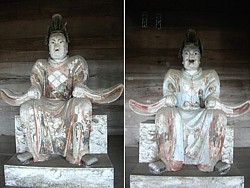左: 寺の仁王門に相当する総門の両袖にはそれぞれ神社を守護する神像が祀られている。衣装の胸には武田菱、江戸末期の作だろうか。