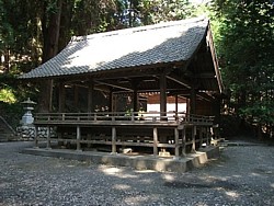 中: 総門を過ぎ、石段の途中から舞殿を見上げる。右側には別棟(控え室の機能か)に続く回廊を設けた珍しい構造を持つ。