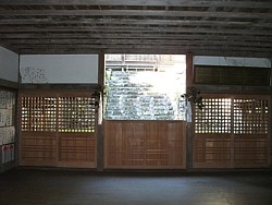 左: 舞殿から拝殿を見上げる。格子を持つ板戸はここの社殿に共通のデザイン、石段はそれぞれの社殿を過ぎるにつれて急傾斜になる。